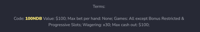 The section you want to focus on is the wagering requirement. This is the section that will lay out what you have to do if you want a chance to convert your 100 free chips into real cash. Most wagering or playthrough requirements read as follows: